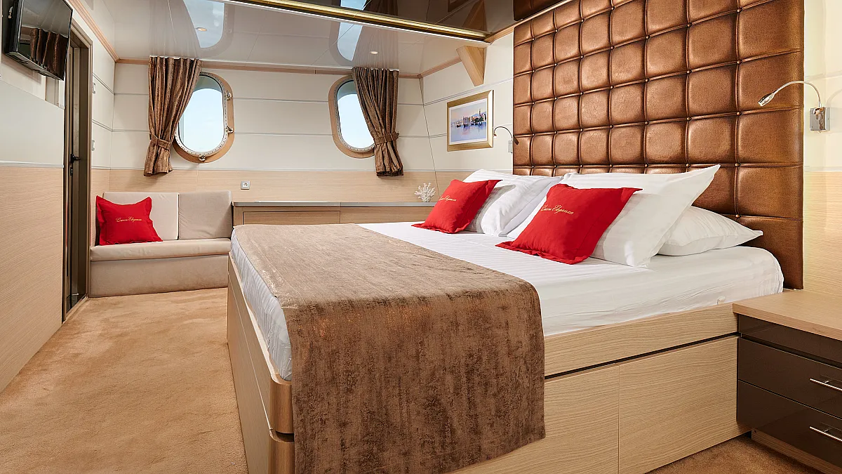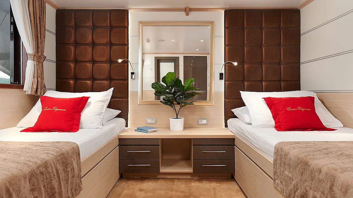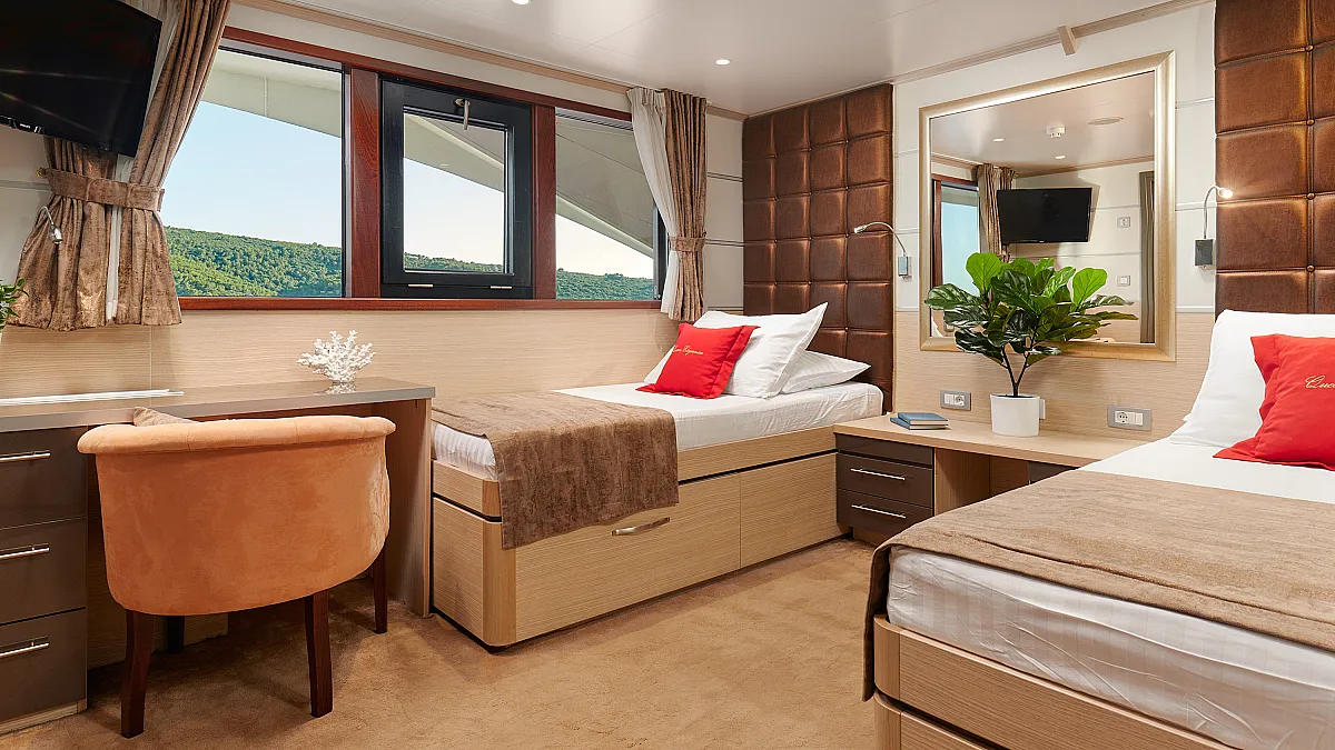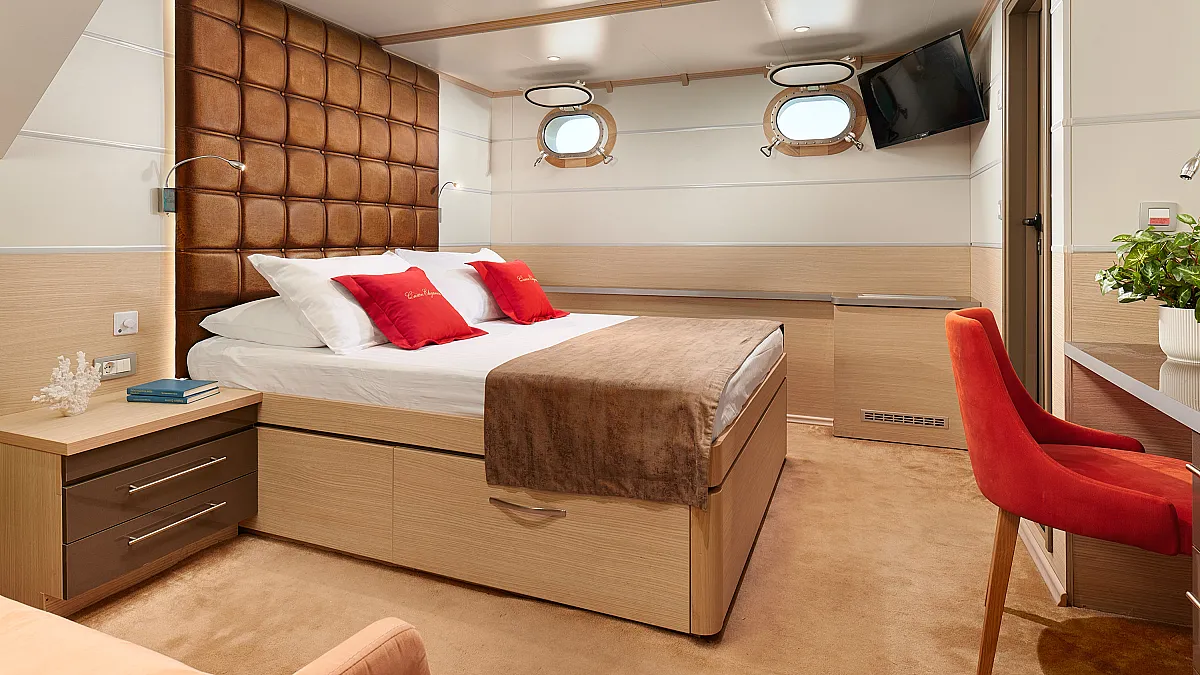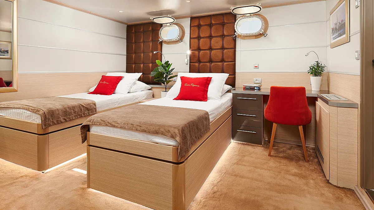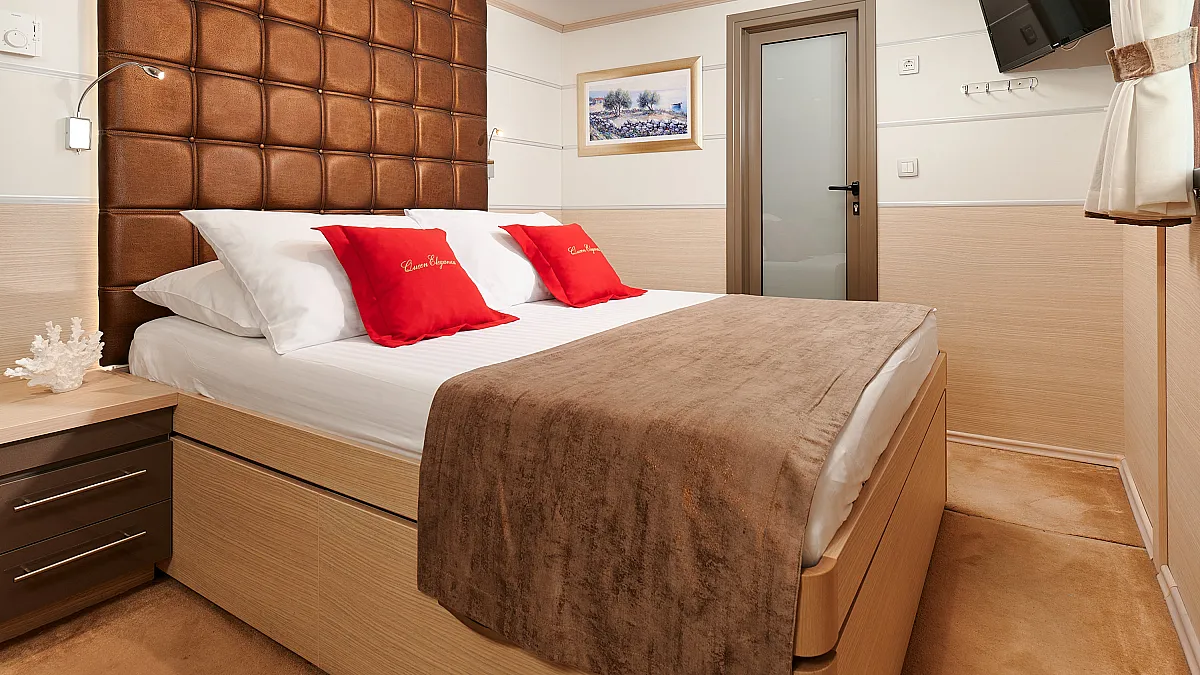 Main Deck: VIP cabin with double bed (180x200 cm). 2 Double cabins with double bed (160x200 cm). 6 Twin cabins with 2 single beds (90x200 cm)