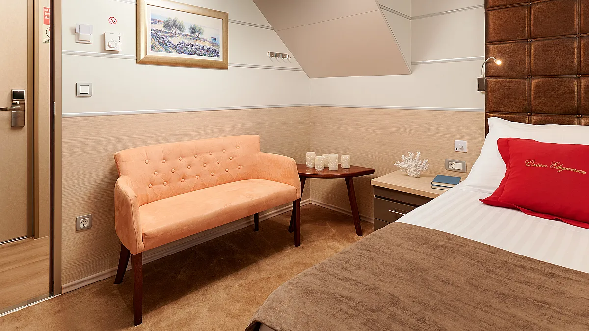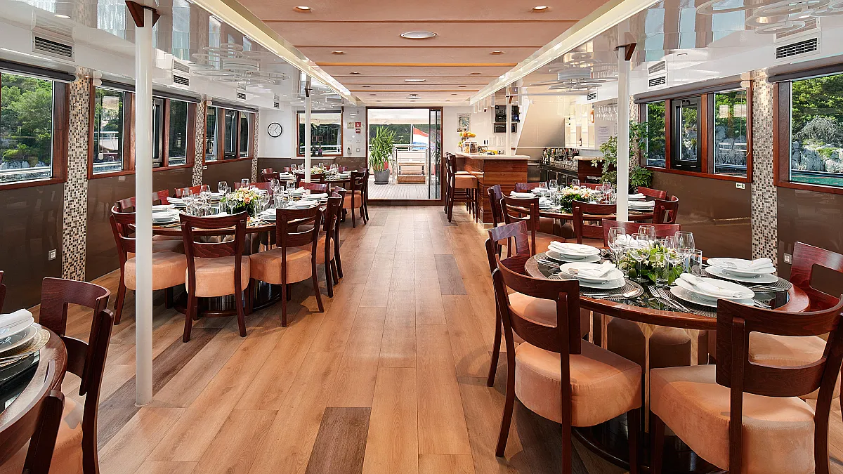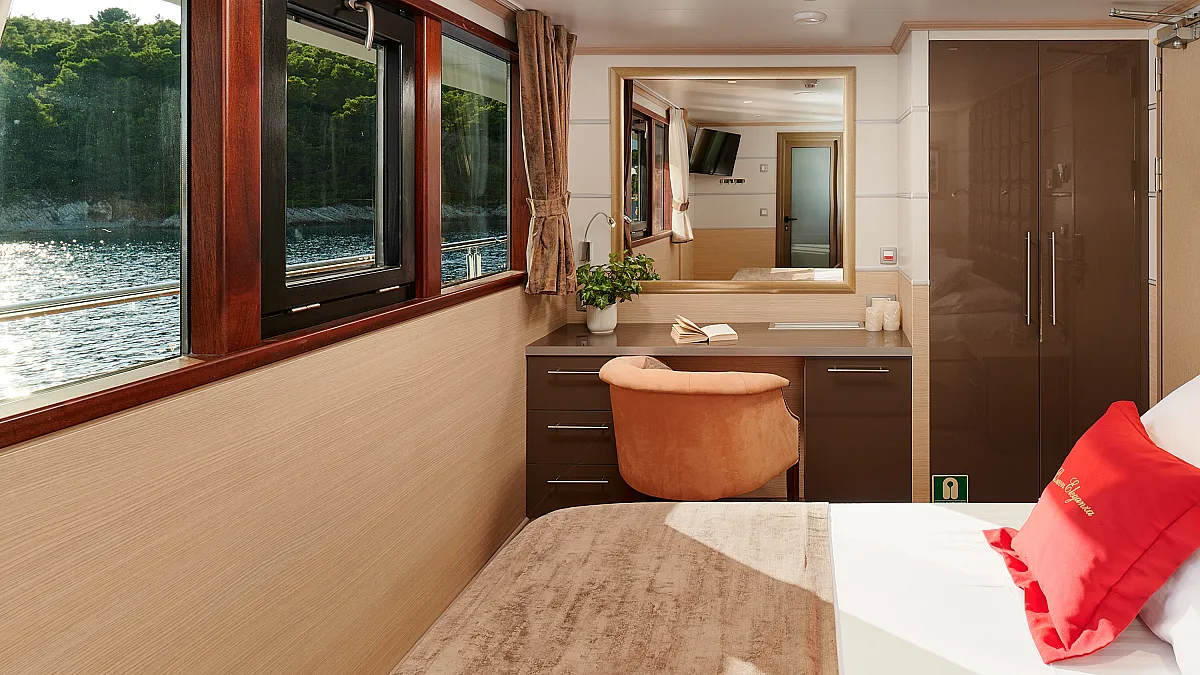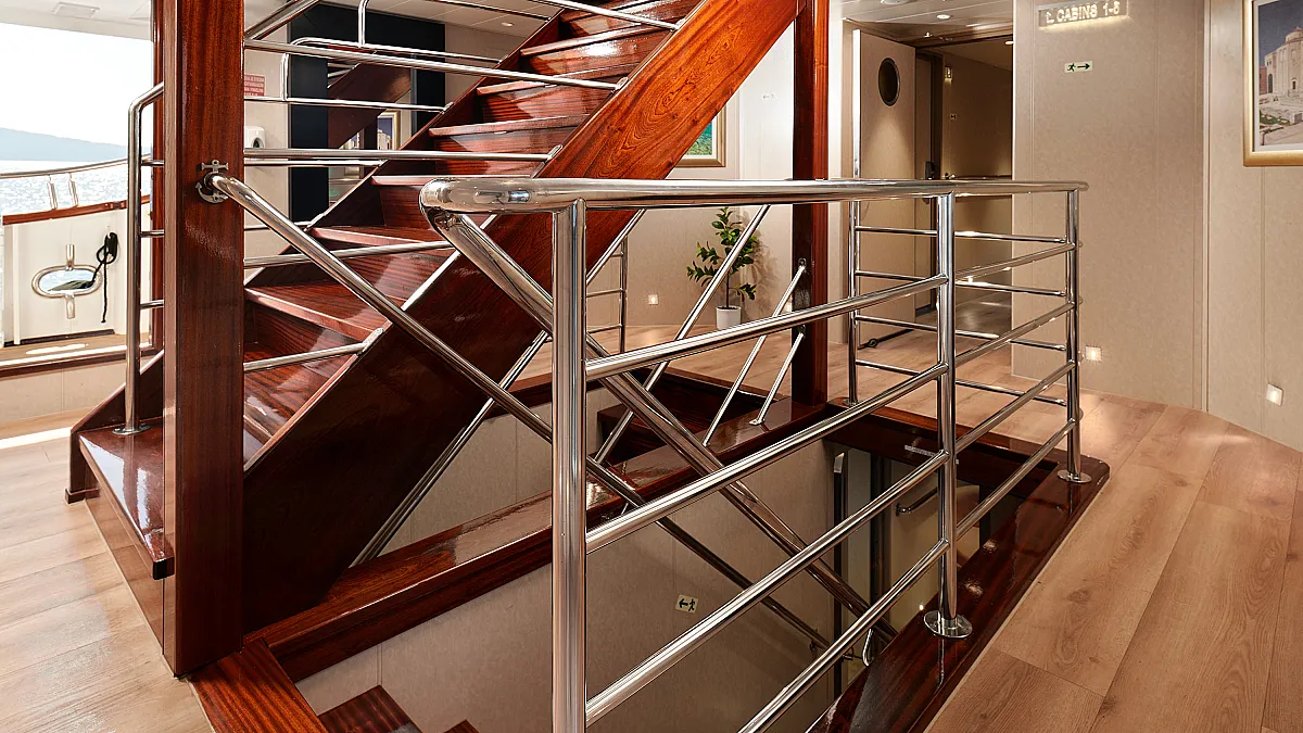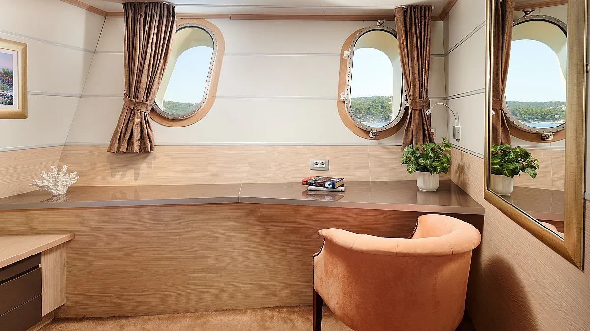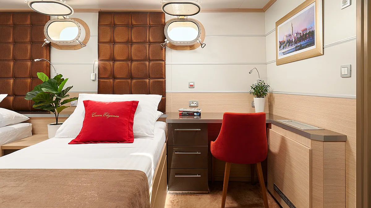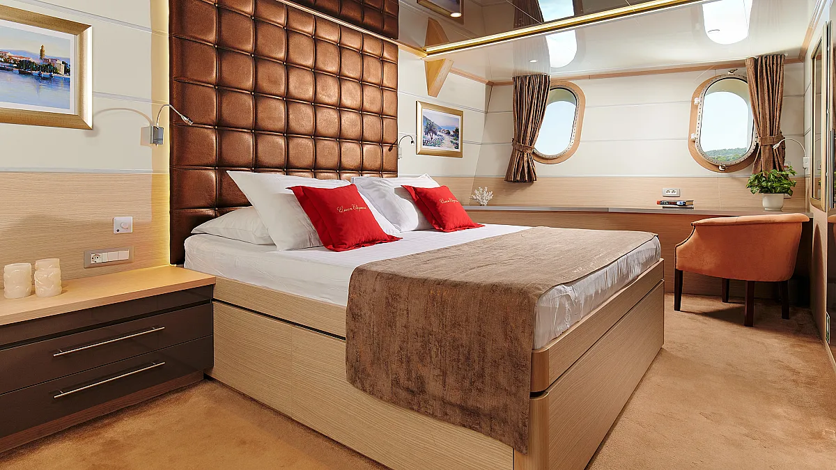 Main Deck: VIP cabin with double bed (180x200 cm). 2 Double cabins with double bed (160x200 cm). 6 Twin cabins with 2 single beds (90x200 cm)