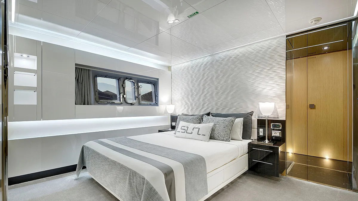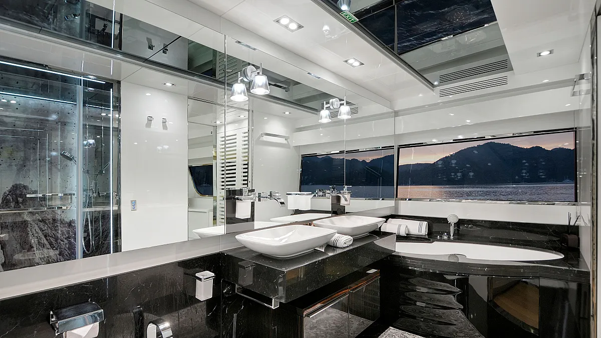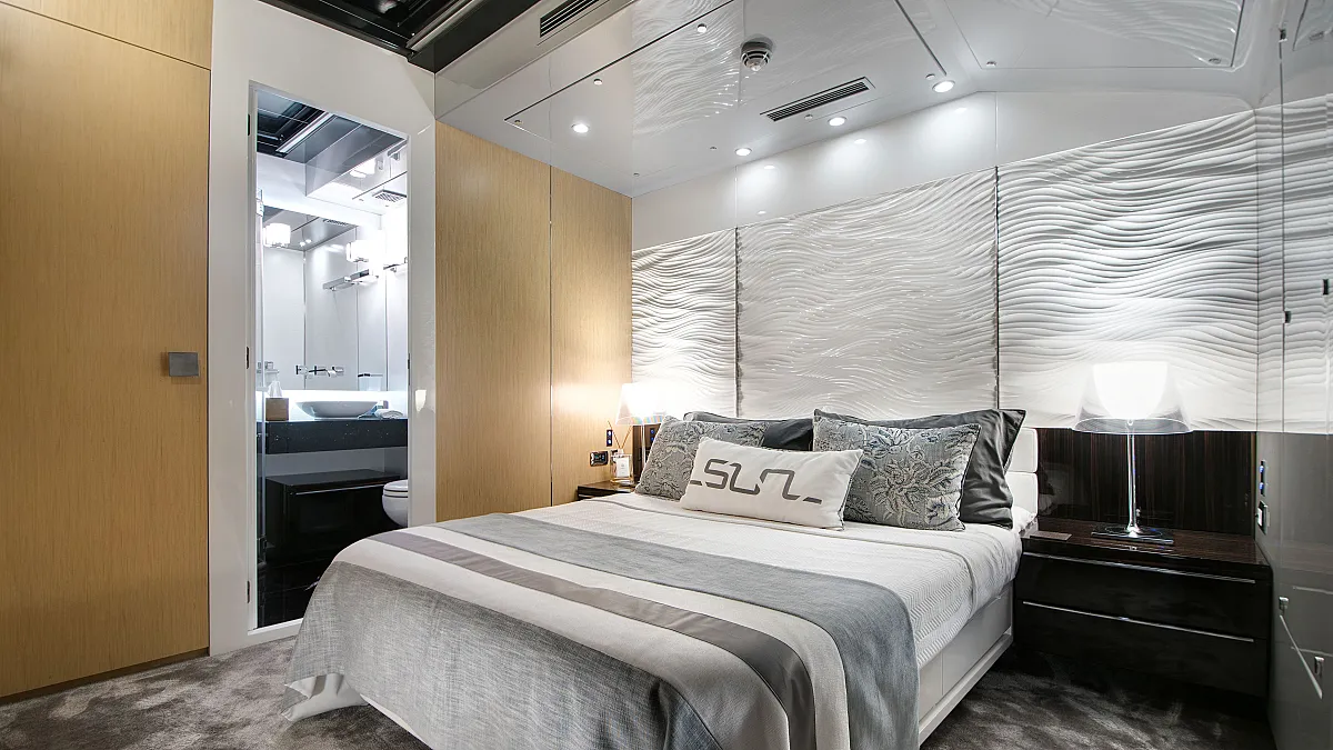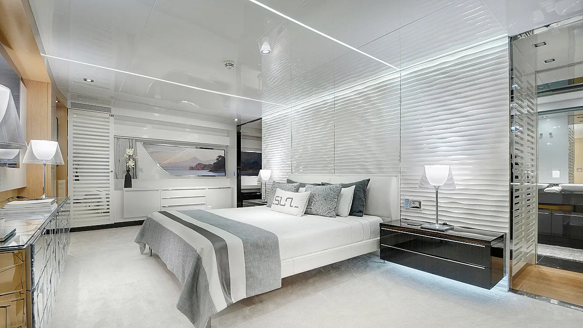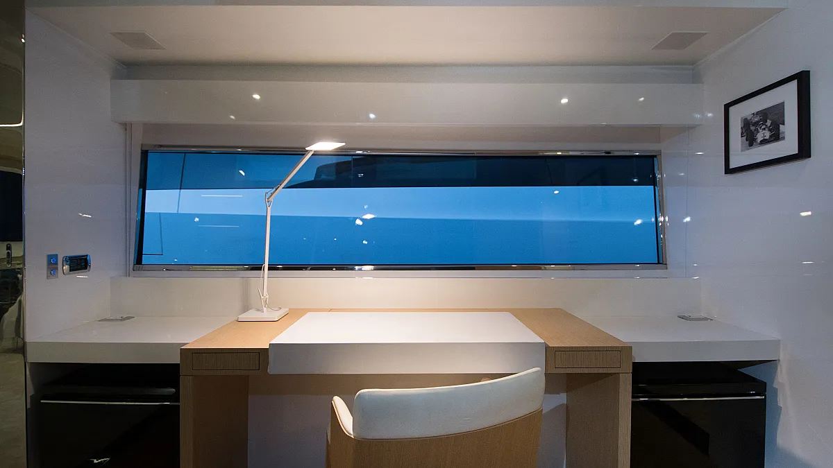 Master cabin on main deck with a centreline king size, large Smart TV, separate office and seating area, and en suite with double sink and shower.