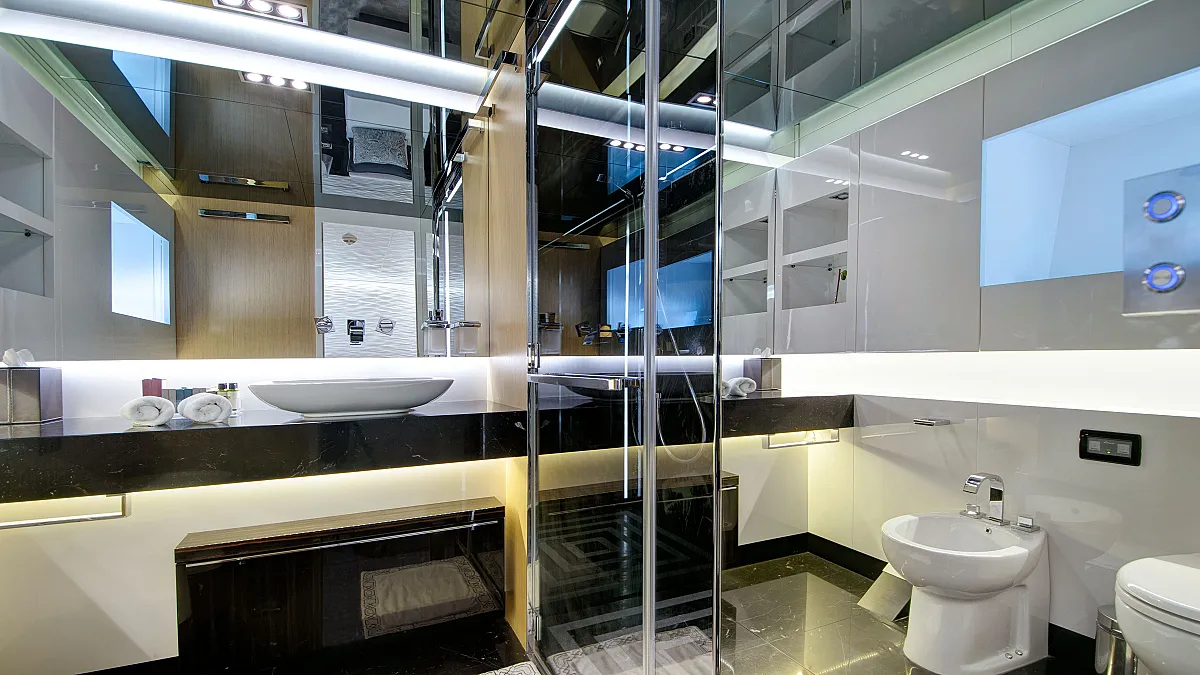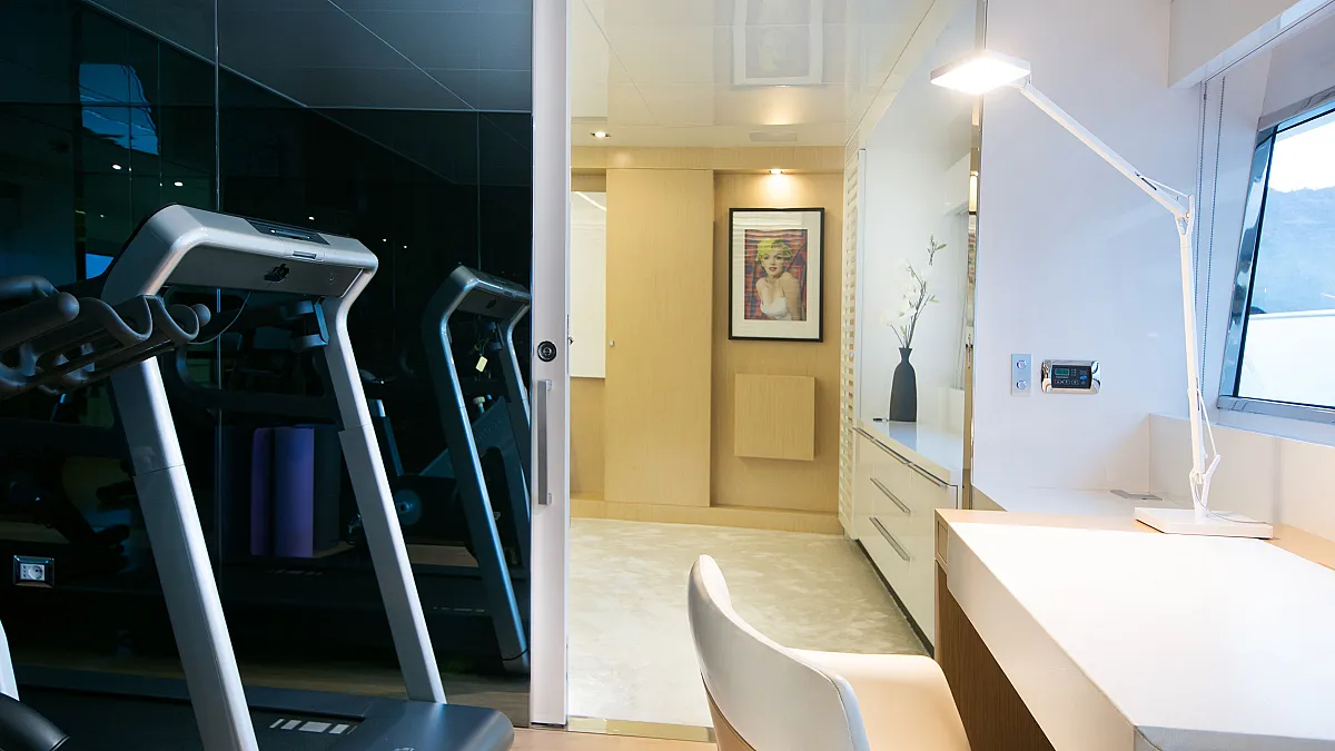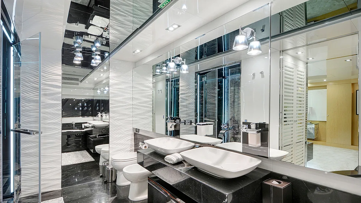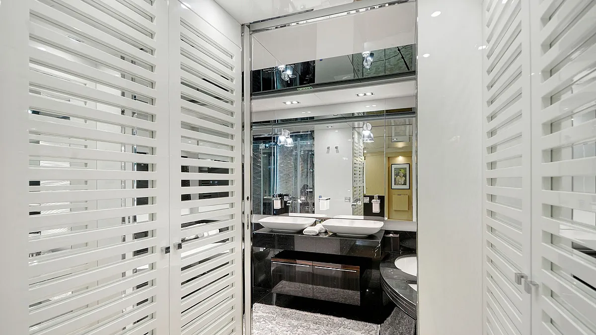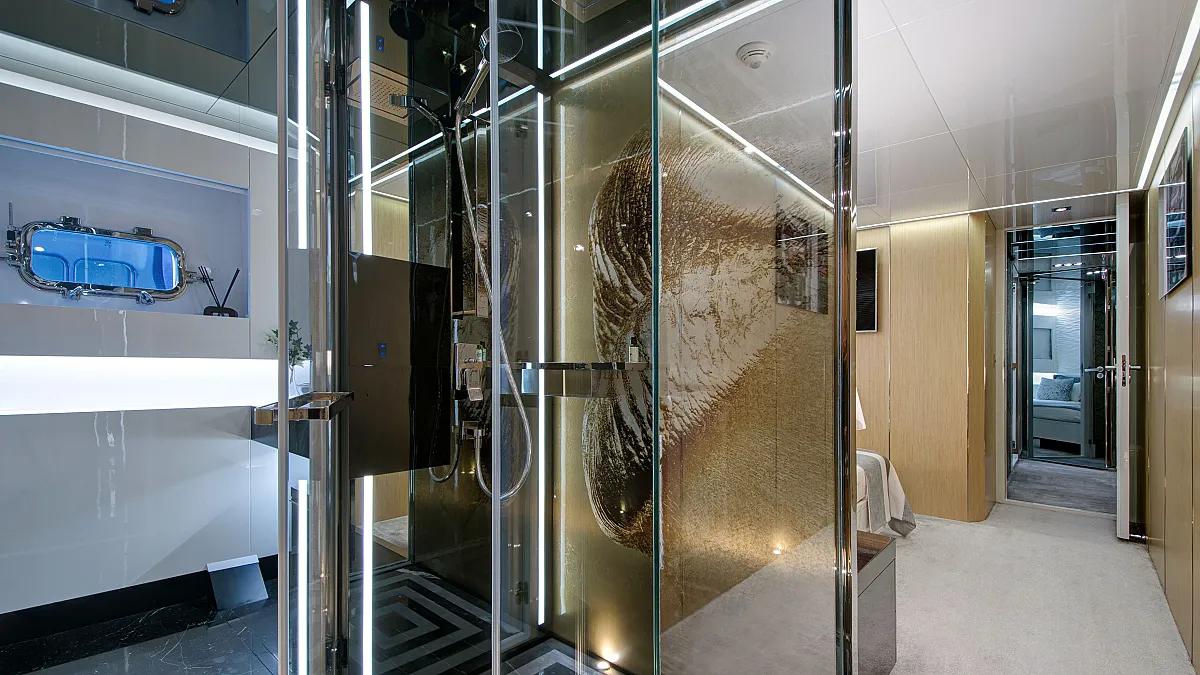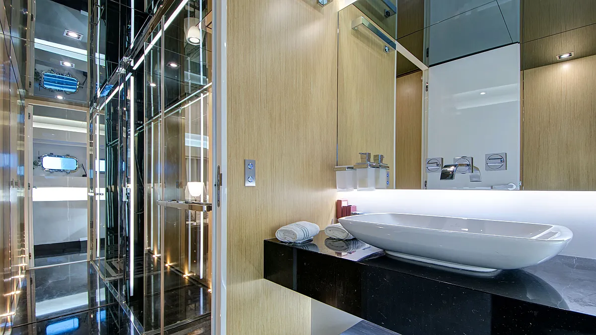 Master cabin on main deck with a centreline king size, large Smart TV, separate office and seating area, and en suite with double sink and shower.