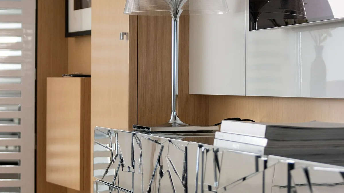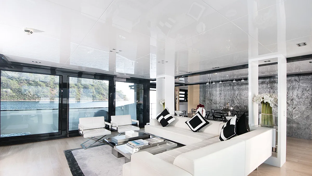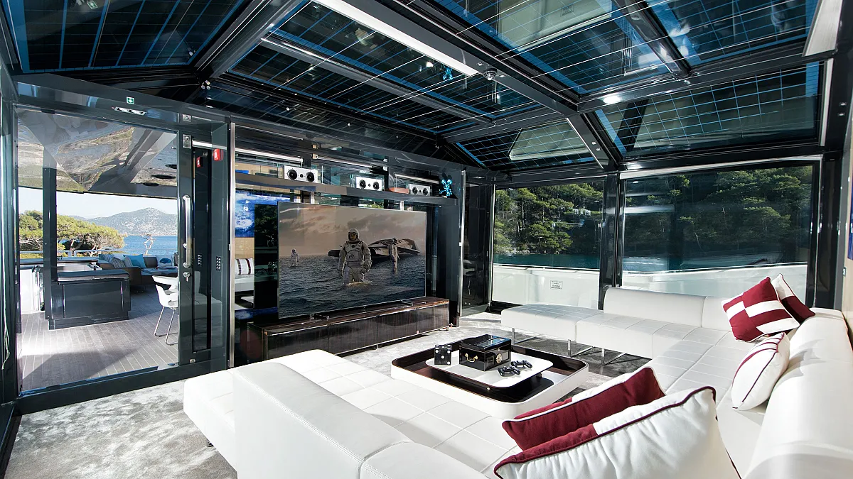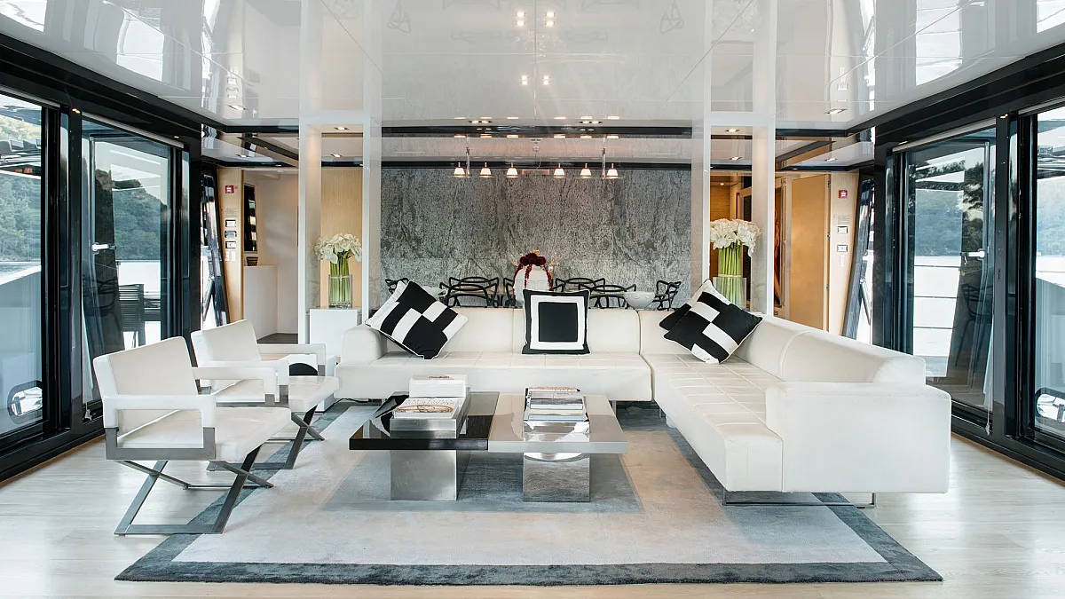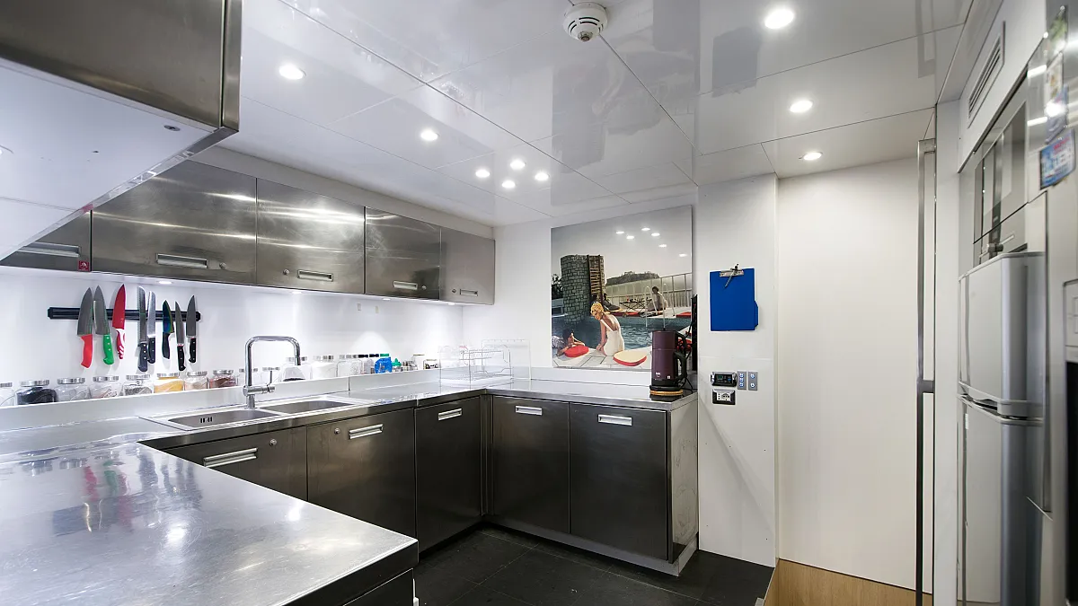 Master cabin on main deck with a centreline king size, large Smart TV, separate office and seating area, and en suite with double sink and shower.