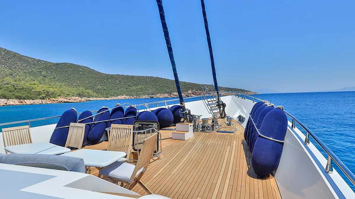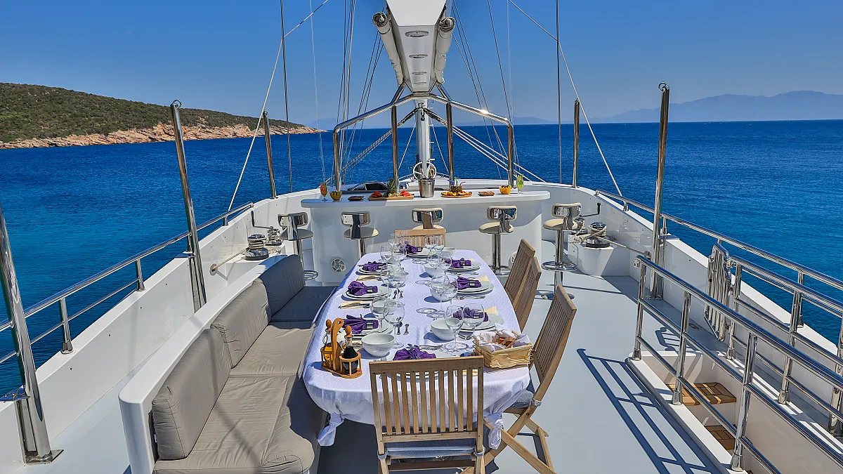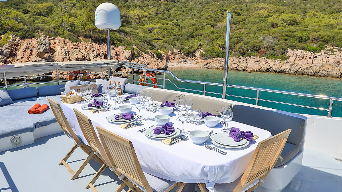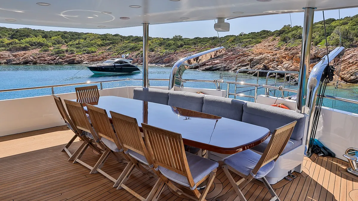 The aft deck dining table can be set up for breakfast or lunch, and besides being an alternative outdoor dining venue is also a wonderful place to gather before taking a trip ashore, or setting sail for the next port of call. CANARIA is a versatile yacht, with a friendly and professional crew, whose singular concern is their guests' comfort and wellbeing. Allow the crew of CANARIA to lavish you with their own style of Mediterranean hospitality as you discover the beauty of this historic corner of the world.