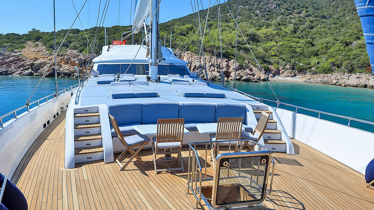 Her larger flybridge exists as a expansive recreation area, complete with a soft sunpad for lounging in the sun or the shade and an inbuilt wet bar and barbeque. The most eye catching feature of the fly deck is a huge dining table, which seats 12 guests in comfort for an al fresco banquet under the stars. By day, it is the perfect place to while away the hours, with a virtually uninterrupted all-around view. In terms of quality of finish, this is a yacht that has been custom-built with only the finest materials and along with "luxury" is also able to sport the label, "safe and sturdy". Perhaps this is where the appeal lies: she is a sailing yacht with a high level of comfort and with all the spaciousness of a motor yacht: gleaming and polished... offering endless possibilities for indoor and outdoor leisure.