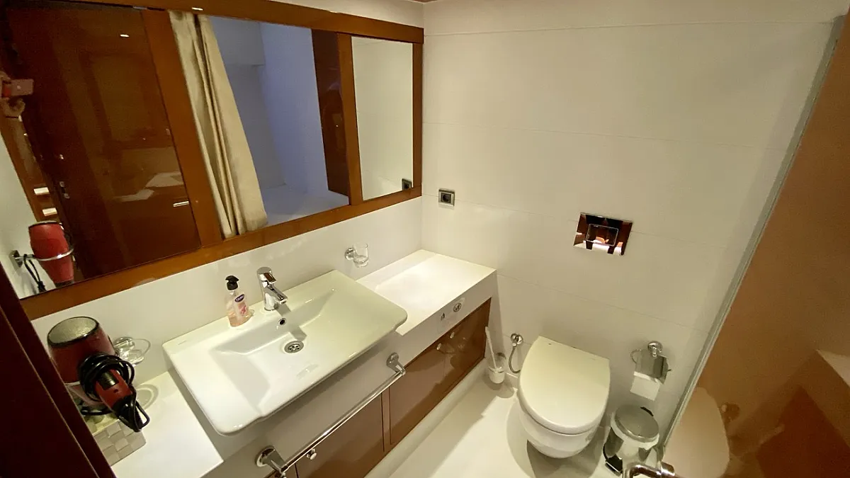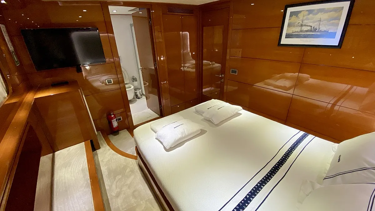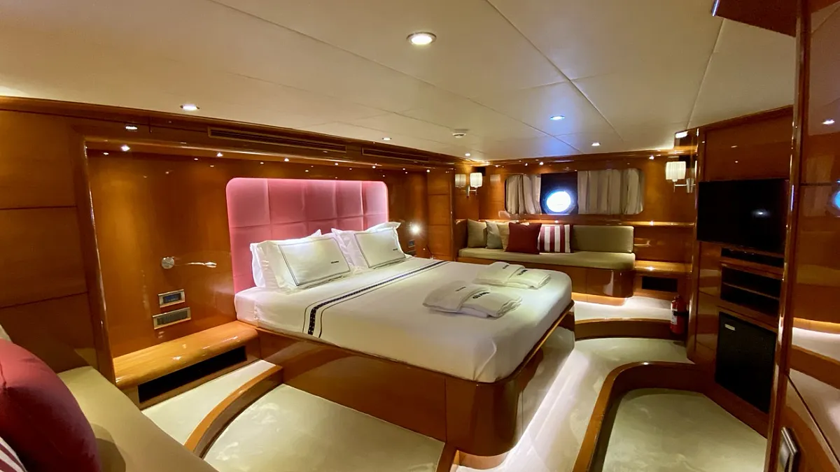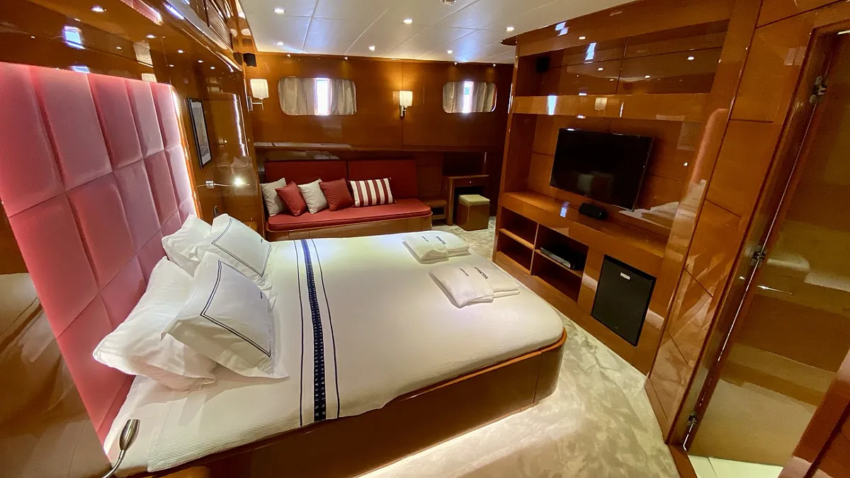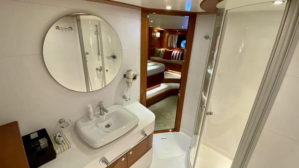 CANARIA offers luxury accommodation for 12 guests in six cabins. The two master cabins, one located forward and one aft, are each extremely spacious and simply decorated with the minimum of fuss. The four VIP cabins: two doubles and two twins, and decorated in the same casual, elegant style. Each of the cabins provides all the necessary amenities, including a large and luminous en suite bathroom. CANARIA's deck saloon is furnished with deep-cushioned sofas and a formal dining table .... and is equipped with a quality hi-fi system, a large screen LCD TV with DVD player and music system. This area easily converts into an entertainment center where lights can also be remotely controlled. A glass door separates the saloon from the aft deck which is a perfectly shady spot in which to relax out of the sun.
