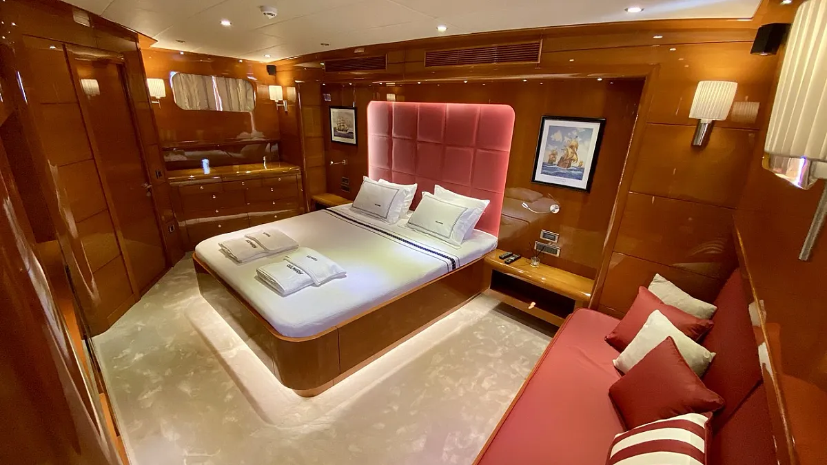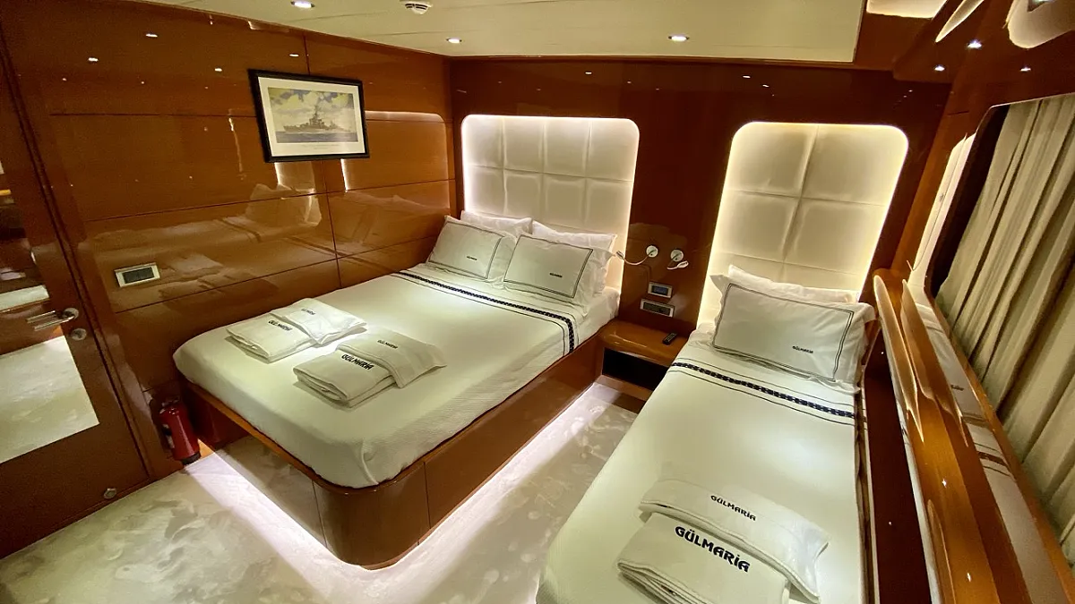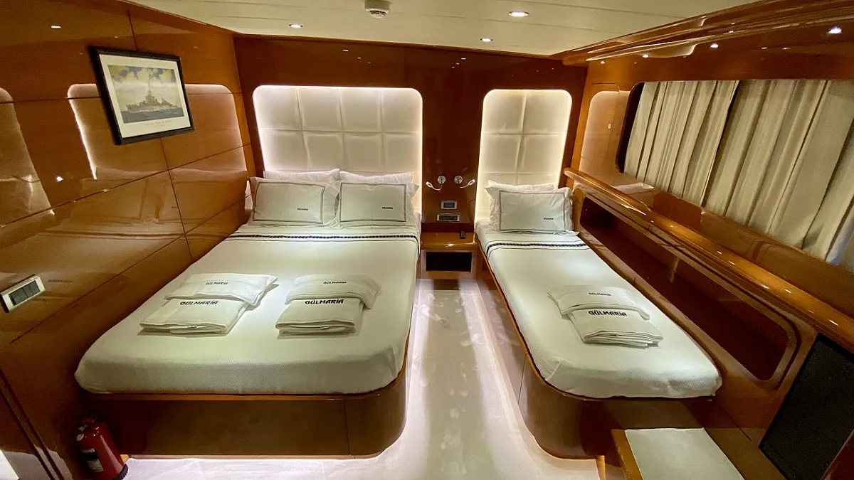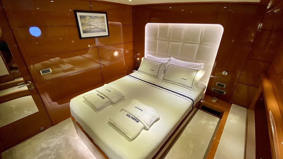 "CANARIA" (ex. Gulmaria) is the encore performance from the designers of the popular, M/S LADY DEISY, a charter yacht which had the kind of chic, Mediterranean casual style which appealed to a broad range of vacationers, and, following three seasons worth of fine tuning, to a certain local gentleman, who now keeps her as his private yacht. In describing "CANARIA" , one could easily say that she is LADY DEISY all over again - lengthened by an additional four metres and offered for parties of up to 12 guests instead of ten - but she is much more: the sleek blue hull of CANARIA holds two full width master cabins, four extra-roomy VIP guest cabins and an abundance of storage space.