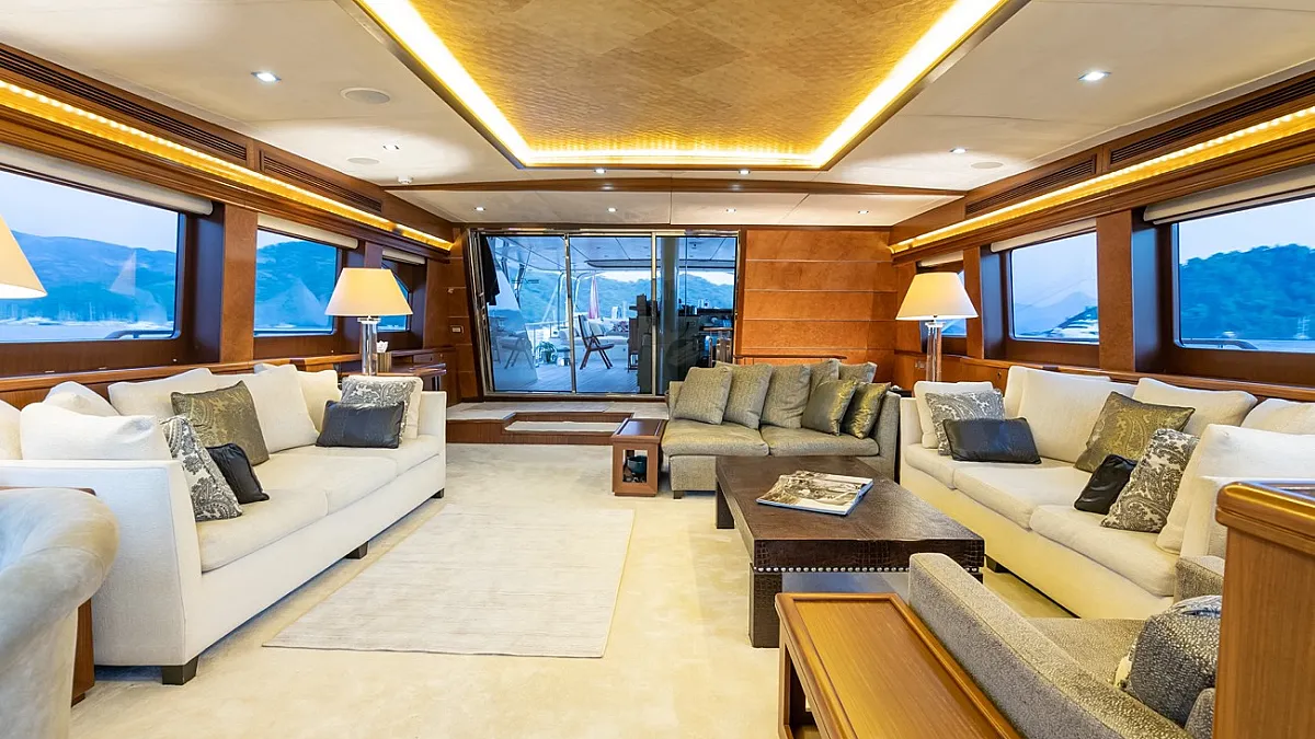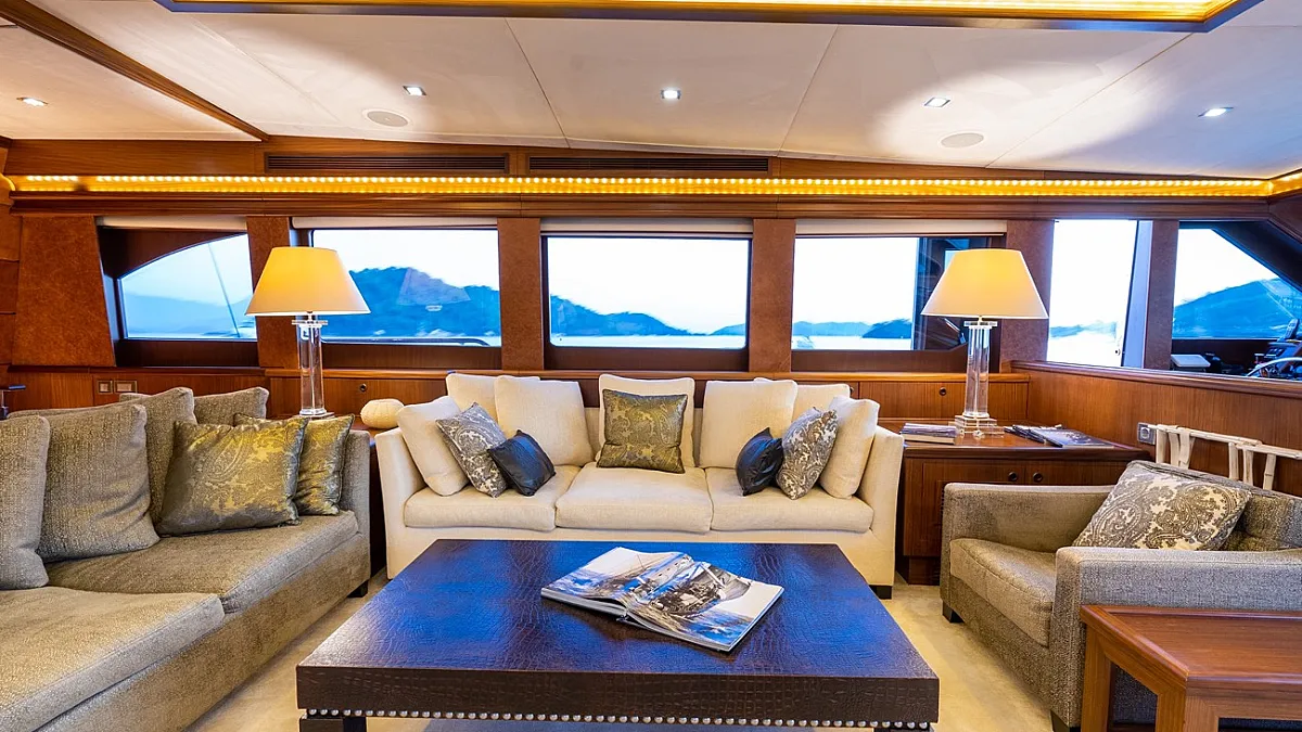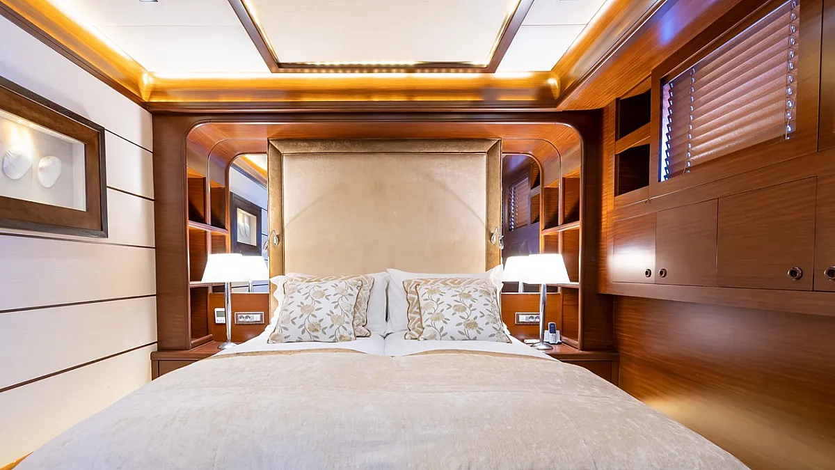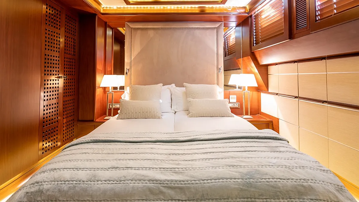 The yacht has a very welcoming interior, beautifully appointed to mirror the classical elegance of the exterior, with tasteful furnishings in cool creams and muted metallics. A party of up to ten guests is accommodated in resounding comfort in five attractively furnished cabins: a full-beam master suite, a VIP double guest suite, a further double guest suite and two twin guest suites.