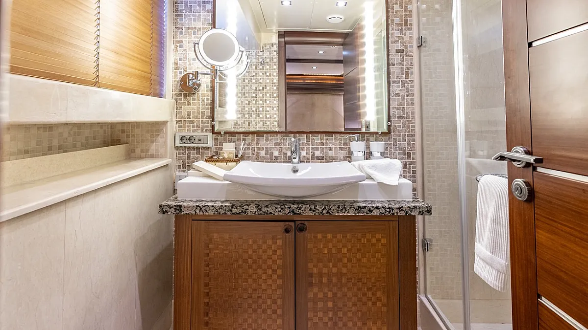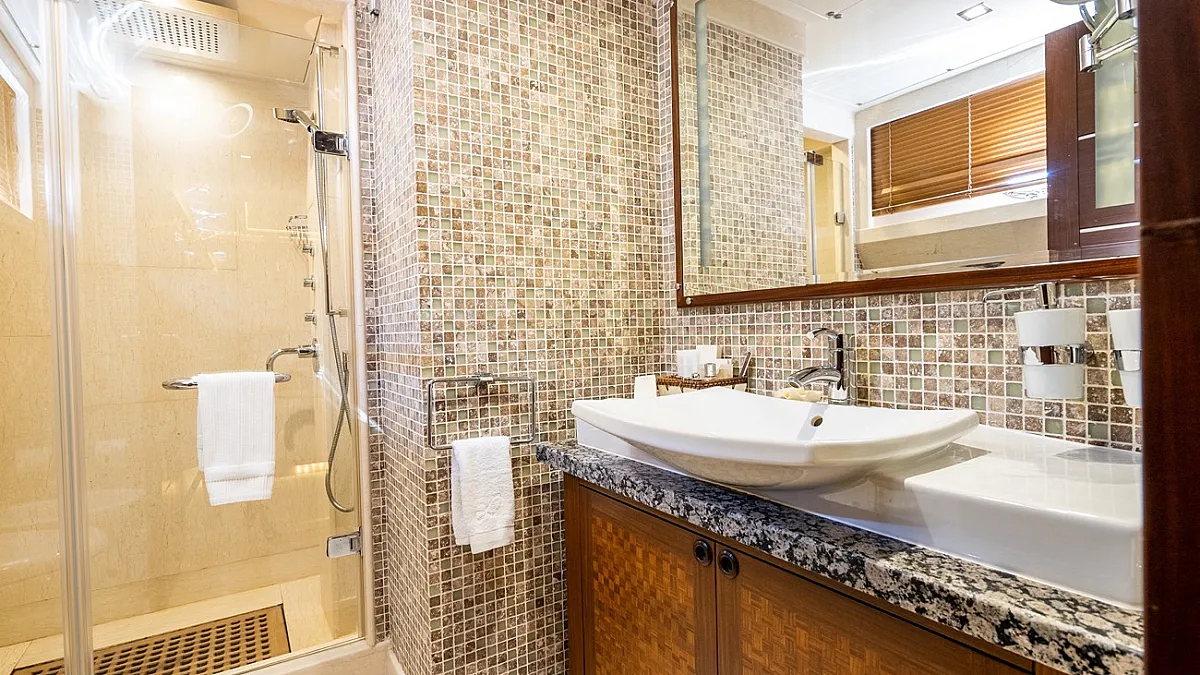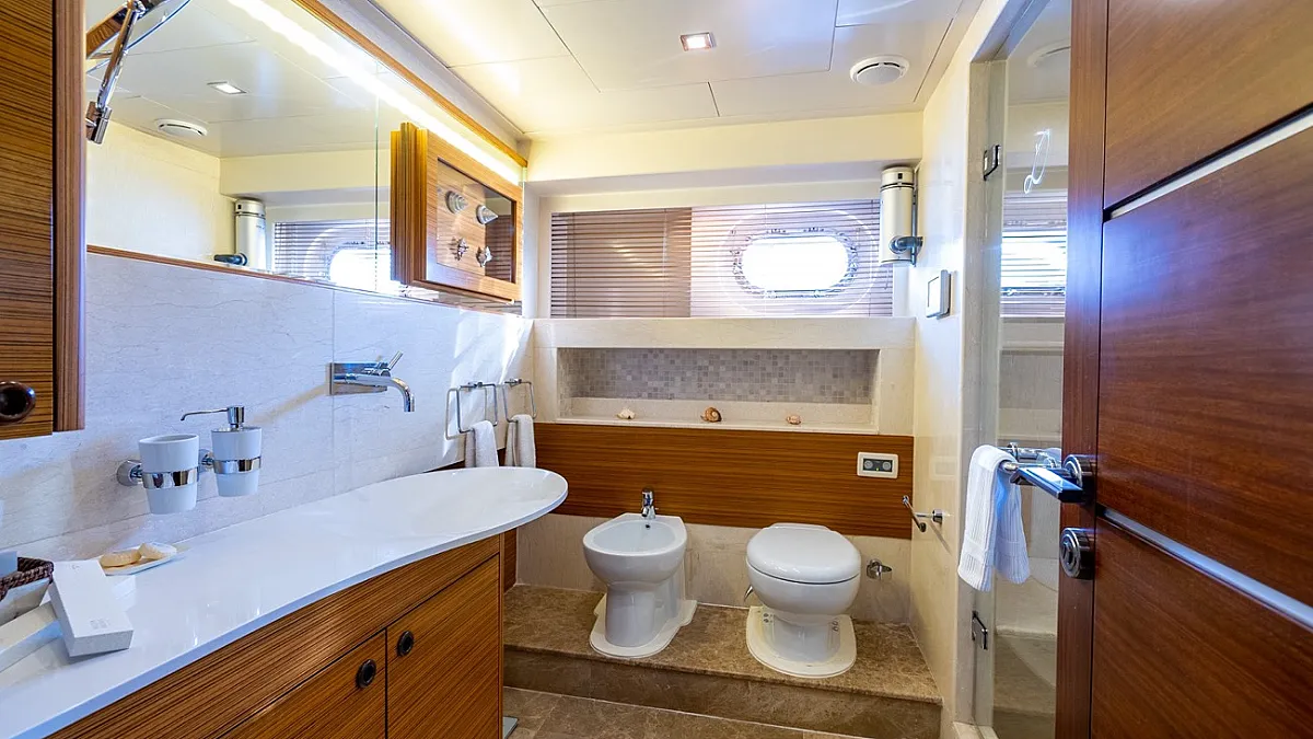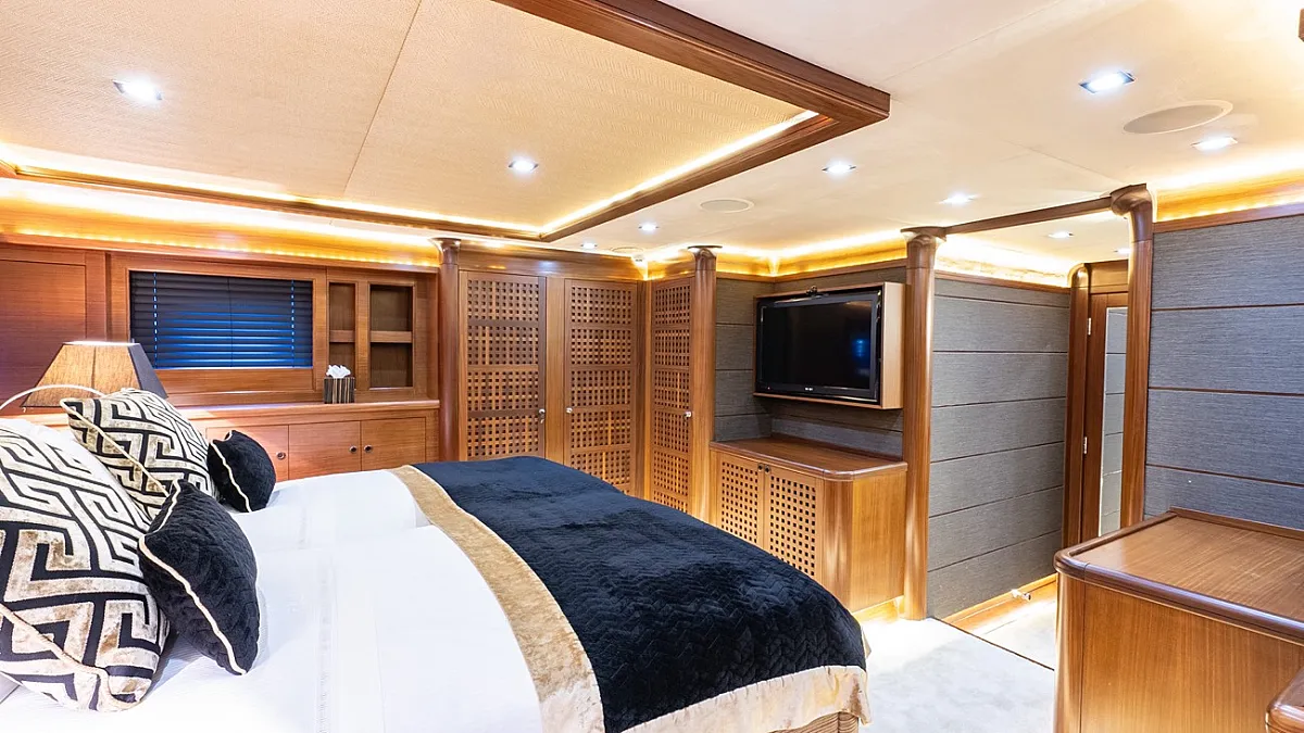 The yacht has a very welcoming interior, beautifully appointed to mirror the classical elegance of the exterior, with tasteful furnishings in cool creams and muted metallics. A party of up to ten guests is accommodated in resounding comfort in five attractively furnished cabins: a full-beam master suite, a VIP double guest suite, a further double guest suite and two twin guest suites.